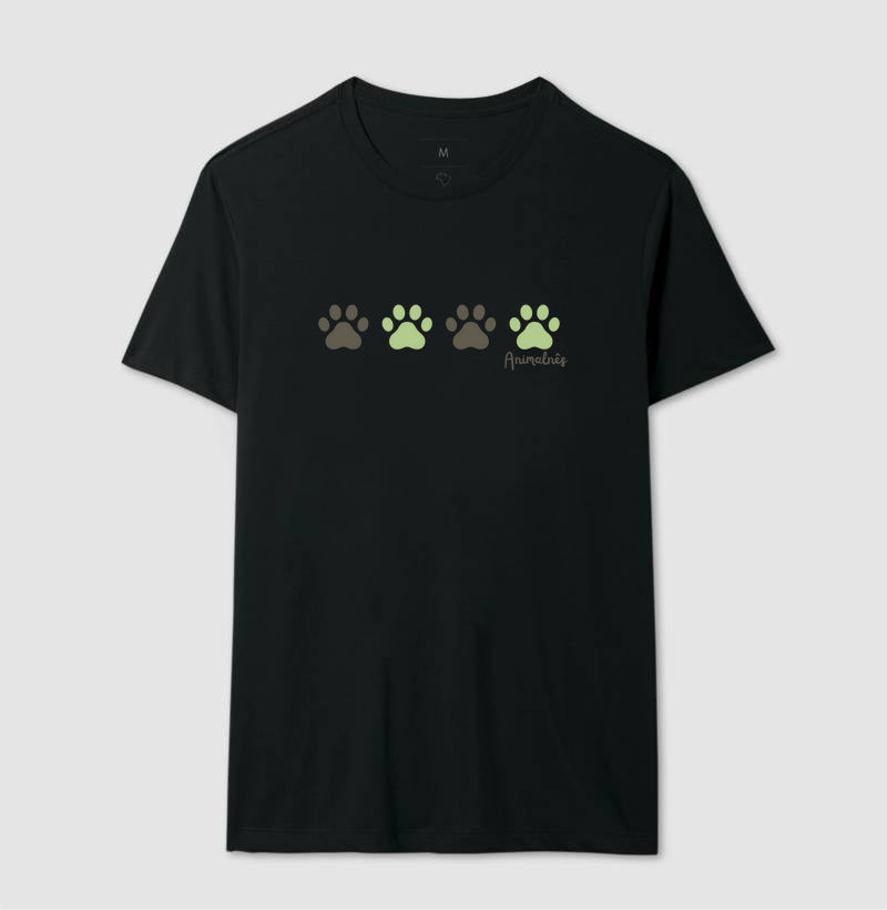 Apresentamos a Camiseta Pegadas, uma peça minimalista e repleta de afeto para quem sente que o amor pelos animais caminha lado a lado com a vida. Com quatro pegadas dispostas em linha — alternando entre preto e verde — e a palavra "Animalnês" logo abaixo em tipografia cursiva, esta camiseta é uma homenagem delicada à presença constante dos nossos companheiros de quatro patas.