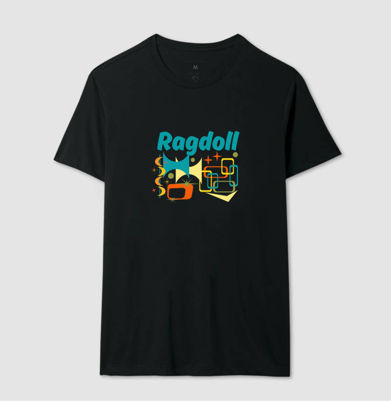 Apresentamos a Camiseta Ragdoll, uma peça que homenageia com leveza e cor a personalidade encantadora dessa raça tão querida. Com a palavra "Ragdoll" em azul-petróleo e uma composição vibrante de formas geométricas, estrelas e cores como laranja, azul e amarelo, esta camiseta transmite a suavidade, a beleza e o charme tranquilo desses gatos que parecem feitos para o colo.